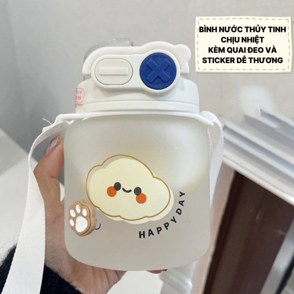 🔥 Bình nước thủy tinh chịu nhiệt Happy day kèm quai đeo và sticker dễ thương đang giảm giá!
